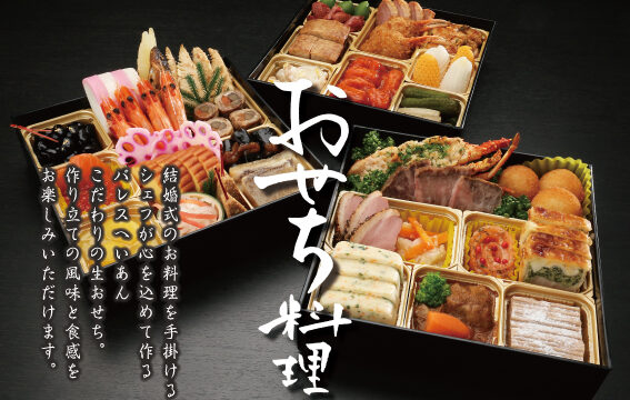 パレスへいあんでは、季節のオードブルやおせち料理が好評をいただいており、会員様には特別価格でご案内しております。皆様の食卓が笑顔に包まれ、日本伝統の行事や風習を守り続けていけますように、願いを込めてお作りします。