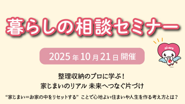暮らしの相談セミナー【整理収納のプロに学ぶ!家じまいのリアル 未来へつなぐ片づけ】を開催いたしました 2025年10月21日(火) 10:30~12:00 パレスへいあんを会場に、片づけ応援隊 LIFE STAR 代表の木戸口 知子さんを講師にお招きし、『整理収納のプロに学ぶ!家じまいのリアル 未...