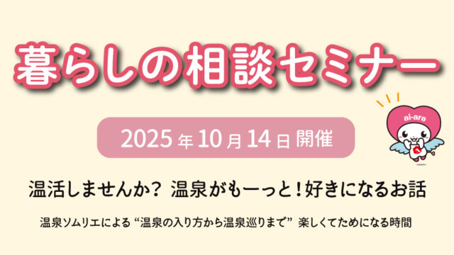 暮らしの相談セミナー【温活しませんか? 温泉がもーっと!好きになるお話】を開催いたしました 2025年10月14日(火) 10:30~12:00 パレスへいあんを会場に、温泉ソムリエマスターの坂本 真由美さんを講師にお招きし、『温活しませんか? 温泉がもーっと!好きになるお話~温泉ソムリエによる ...