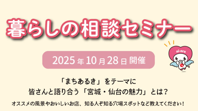 暮らしの相談セミナー【「まちあるき」をテーマに皆さんと語り合う「宮城・仙台の魅力」とは?】を開催いたしました 2025年10月28日(火)10:30~12:00、パレスへいあんを会場に、株式会社たびむすび 代表取締役の稲葉さんを講師にお迎えし、【「まちあるき」をテーマに皆さんと語り合う「宮城・仙台...