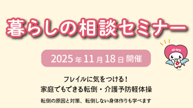 暮らしの相談セミナー【フレイルに気をつける!家庭でもできる転倒・介護予防軽体操】を開催いたしました 2025年11月18日(火) 10:30~12:00 パレスへいあんを会場に、作業療法士の資格をお持ちの加藤 大地さんを講師にお招きし、『フレイルに気をつける!家庭でもできる転倒・介護予防軽体操 ~...