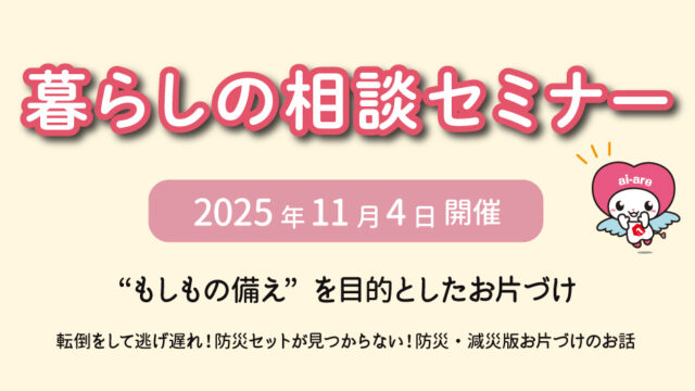 暮らしの相談セミナー【“もしもの備え”を目的としたお片づけ】を開催いたしました 2025年11月4日(火) 10:30~12:00 パレスへいあんを会場に、お片づけのプロ 整理収納アドバイザーの佐藤遥香さんを講師にお招きし、『“もしもの備え”を目的としたお片づけ~転倒をして逃げ遅れ!防災セットが見...