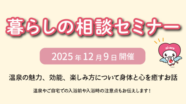 2025年12月9日(火) 【暮らしの相談セミナー】本日のテーマ 温泉の魅力、効能、楽しみ方について身体と心を癒すお話 ~温泉やご自宅での入浴前や入浴時の注意点もお伝えします!~ パレスへいあんを会場に、温泉ソムリエマスターの坂本 真由美さんを講師にお招きして、一生涯使える温泉入浴法&活用術が学べる...