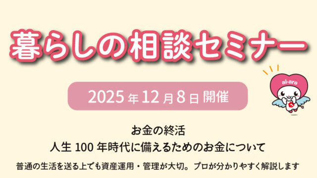 暮らしの相談セミナー「お金の終活 人生100年時代に備えるためのお金について」を開催いたしました 2025年12月8日(月) 10:30~12:00にパレスへいあんを会場に、NFC合同会社 家計アドバイザー・ファイナンシャルアドバイザーの髙橋 秀(みのる)さんを講師にお招きし、 『お金の終活 人生1...