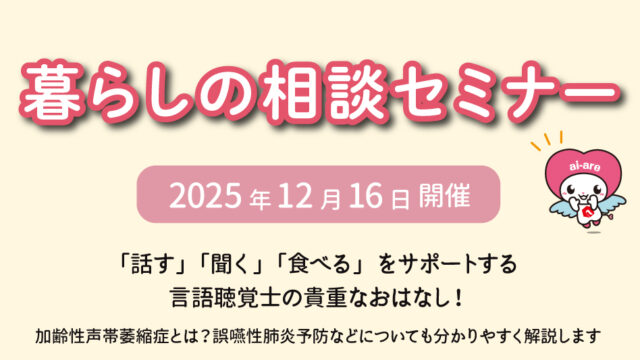 2025年12月16日(火) 【暮らしの相談セミナー】本日のテーマ 「話す」「聞く」「食べる」をサポートする言語聴覚士の貴重なおはなし! ~加齢性声帯萎縮症とは?誤えん性肺炎予防などについても分かりやすく解説します~ パレスへいあんを会場に、パルクシステム株式会社 ソーシャルワーク事業部 部長の泉 ...