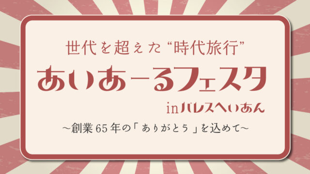 あの熱狂が再び!パレスへいあんにて 【世代を超えた“時代旅行”あいあーるフェスタ~創業65年の「ありがとう」を込めて~】を開催いたします! 地域のみなさまに支えられ、あいあーるは創業65年を迎えます。 「ありがとう」の感謝の気持ちを込めて、昭和生まれも平成生まれも世代を超えてお楽しみいただけるイベン...